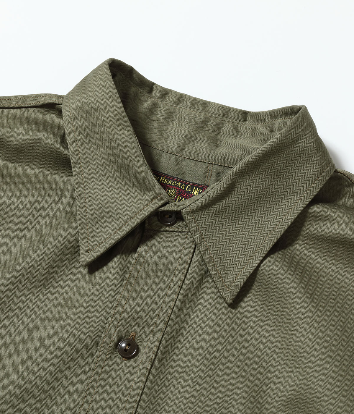 This shirt is a Buzz Rickson’s original, with approximately twice the yarn density compared to regular herringbone fabric used in this type of shirt, making it highly durable and increasing its texture with wear.