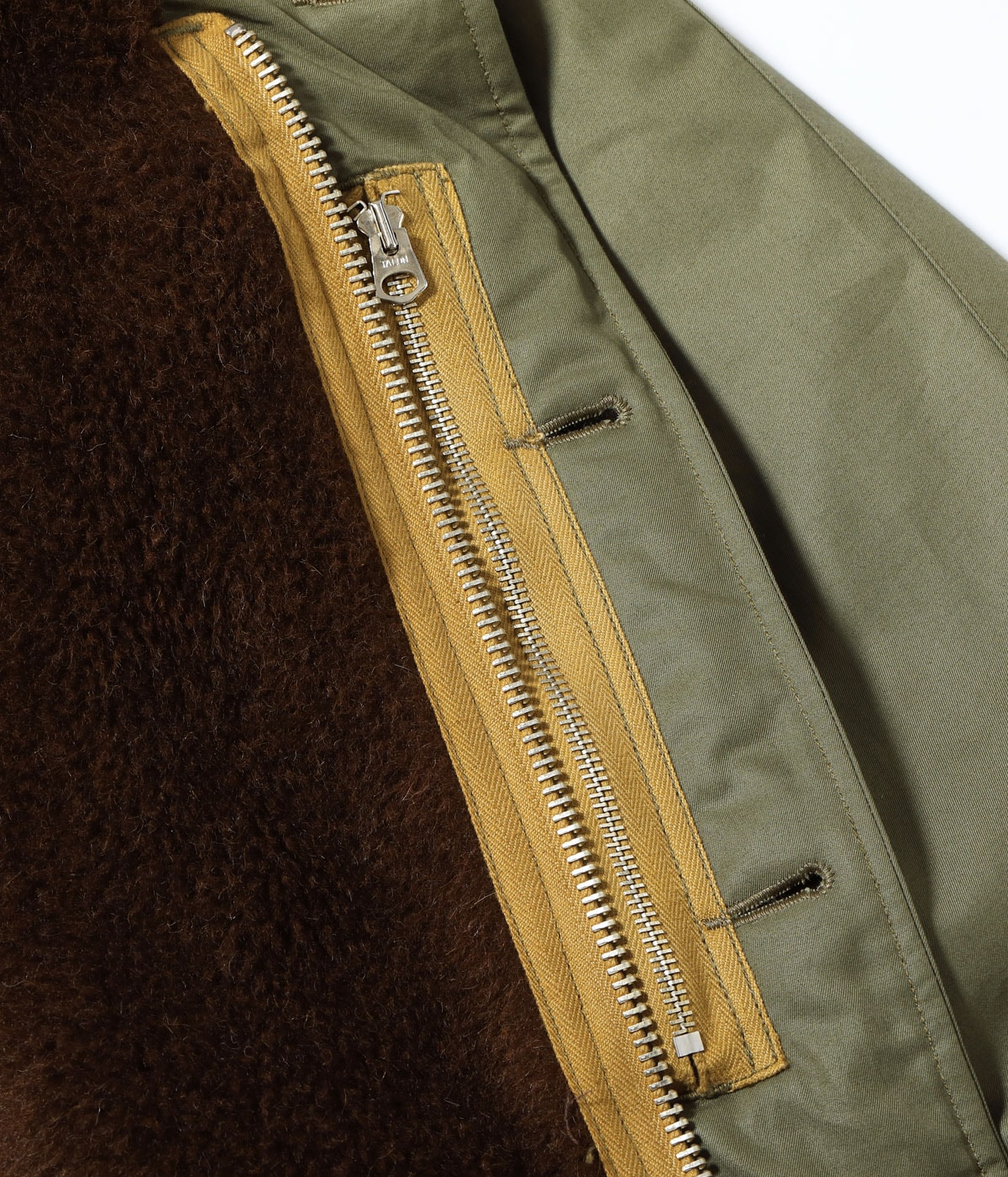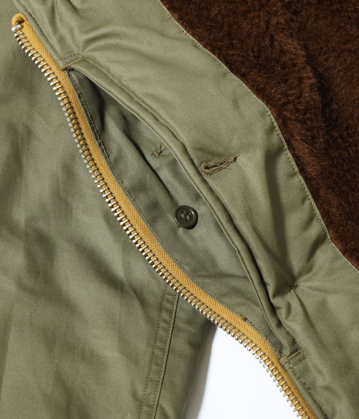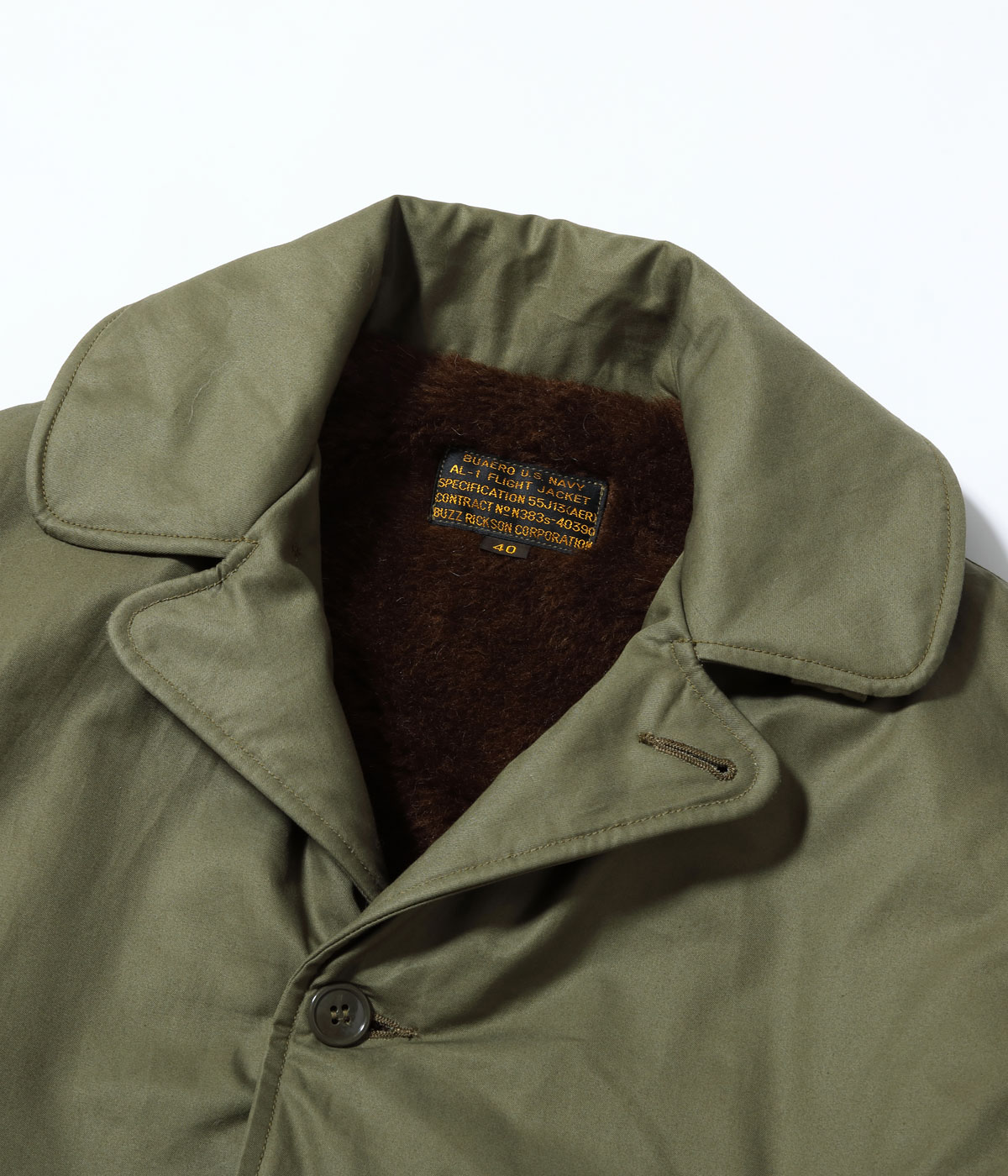The AL-1 is a winter flight jacket adopted by the BUAER (Bureau of Aeronautics) from the late 1940s to early 1950s, designed to be worn together with the AW-1 hood. The outer fabric is a high-density cotton combed twill, which is supple yet highly wind-resistant. The body lining uses alpaca mohair wool pile, while the sleeves are lined with smooth rayon wool, and inside that, wool flannel is sewn in as insulation. The front features a double closure system with both zipper and buttons for enhanced cold protection. Inside, there are pockets on both sides; the left inner pocket has a zipper and can be used even when the front zipper is closed. An adjustable strap is installed at the waist inside the lining for improved fit. Additionally, the slash pockets incorporate internal ribbing to block outside air—a rare feature not seen on other jackets. The AL-1 comes in two variations: one with ribbed cuffs and another with zippered cuffs, depending on the contractor. The extensive use of diverse materials and intricate design clearly shows the Navy’s deep commitment and passion invested in this jacket.