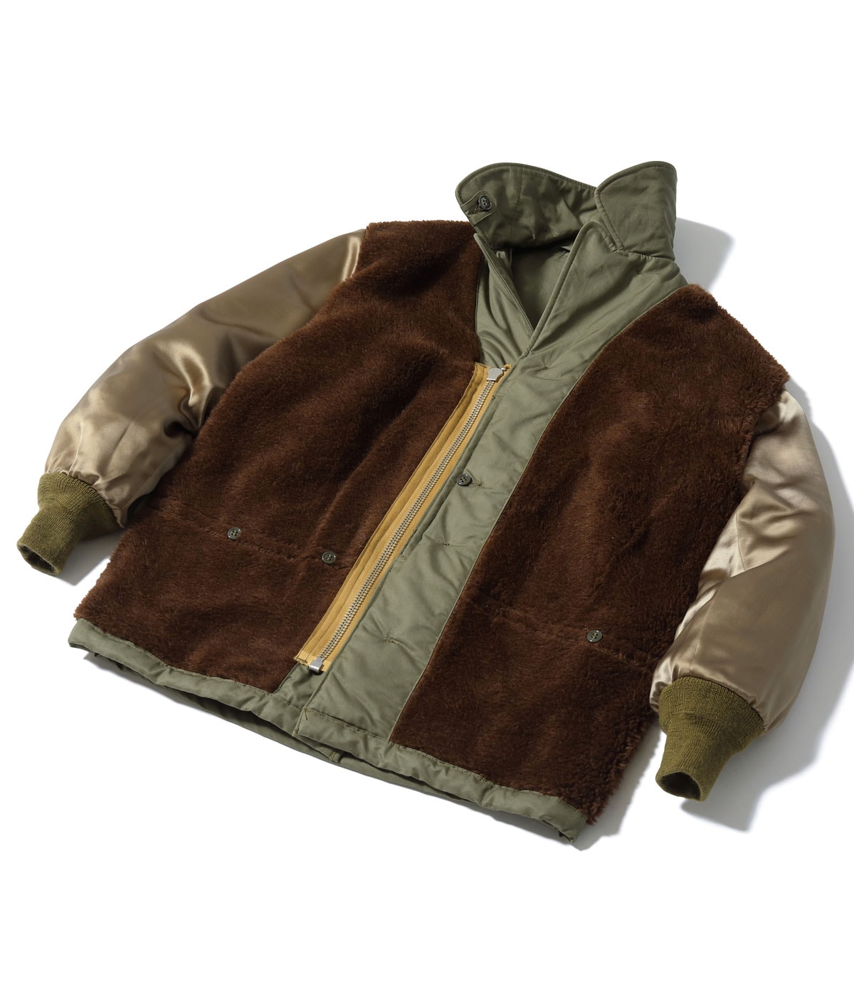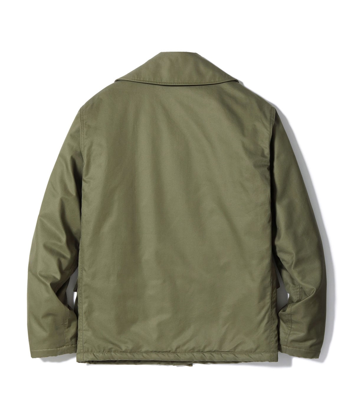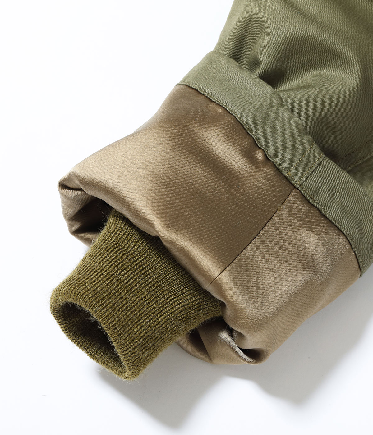 The AL-1 is a winter flight jacket adopted by the BUAER (Bureau of Aeronautics) from the late 1940s to early 1950s, designed to be worn together with the AW-1 hood. The outer fabric is a high-density cotton combed twill, which is supple yet highly wind-resistant. The body lining uses alpaca mohair wool pile, while the sleeves are lined with smooth rayon wool, and inside that, wool flannel is sewn in as insulation. The front features a double closure system with both zipper and buttons for enhanced cold protection. Inside, there are pockets on both sides; the left inner pocket has a zipper and can be used even when the front zipper is closed. An adjustable strap is installed at the waist inside the lining for improved fit. Additionally, the slash pockets incorporate internal ribbing to block outside air—a rare feature not seen on other jackets. The AL-1 comes in two variations: one with ribbed cuffs and another with zippered cuffs, depending on the contractor. The extensive use of diverse materials and intricate design clearly shows the Navy’s deep commitment and passion invested in this jacket.