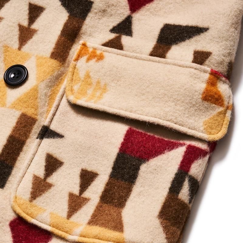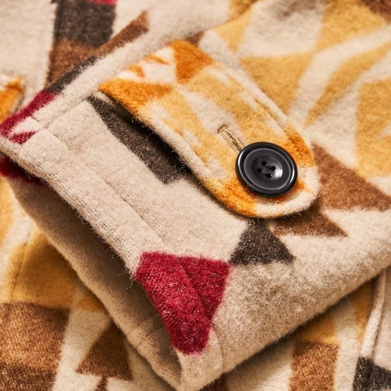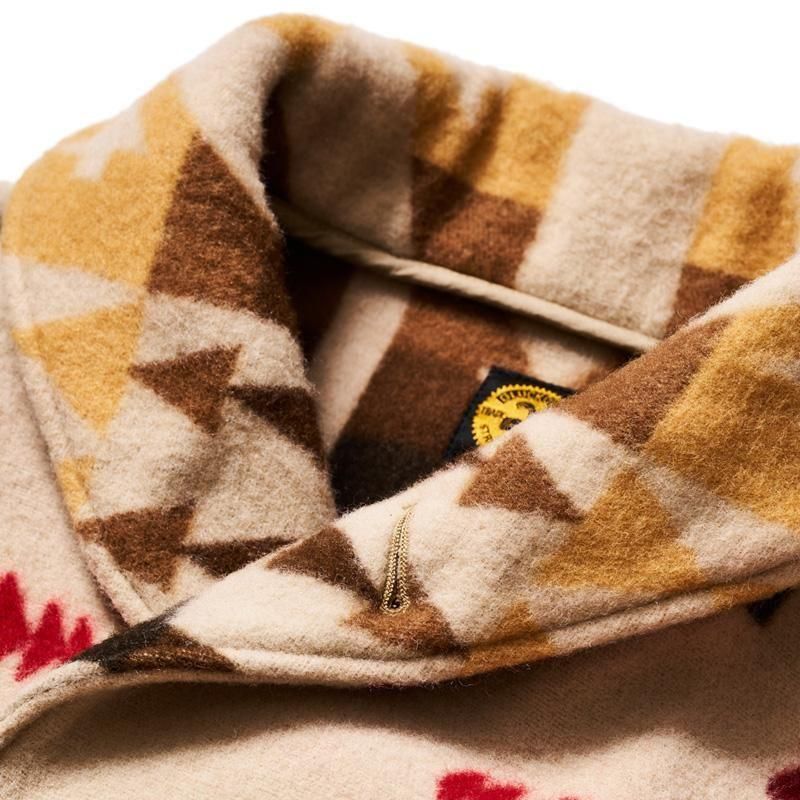 The Mackinaw Blanket Coat is known for its tightly woven wool waterproof fabric, hip-length coat, and rounded shawl collar. In the early 1800s, a British officer stationed in Canada near Mackinac Island desperately needed warm winter coats for his men. He ordered a wool blanket from Hudson’s Bay Company, and the blanket coat was born. Crafted from a beautifully patterned wool developed for the White Stag Co the previous year, the Mackinaw Blanket Coat features a shawl collar, two low patch pockets, and strap cuffs. Simple and charming, I hope you love it as much as I do. 75% wool, 25% cotton, jacquard, original nut buttons