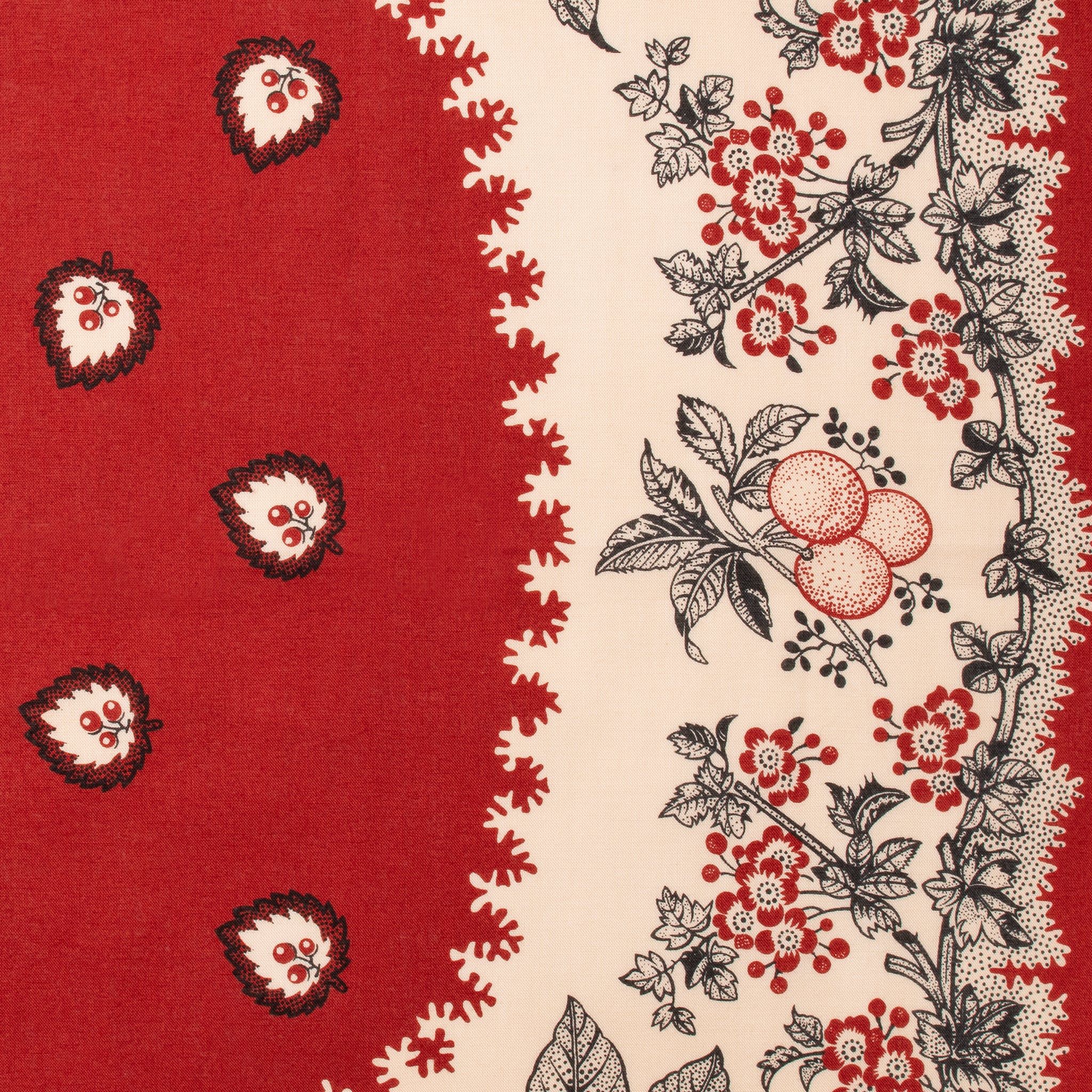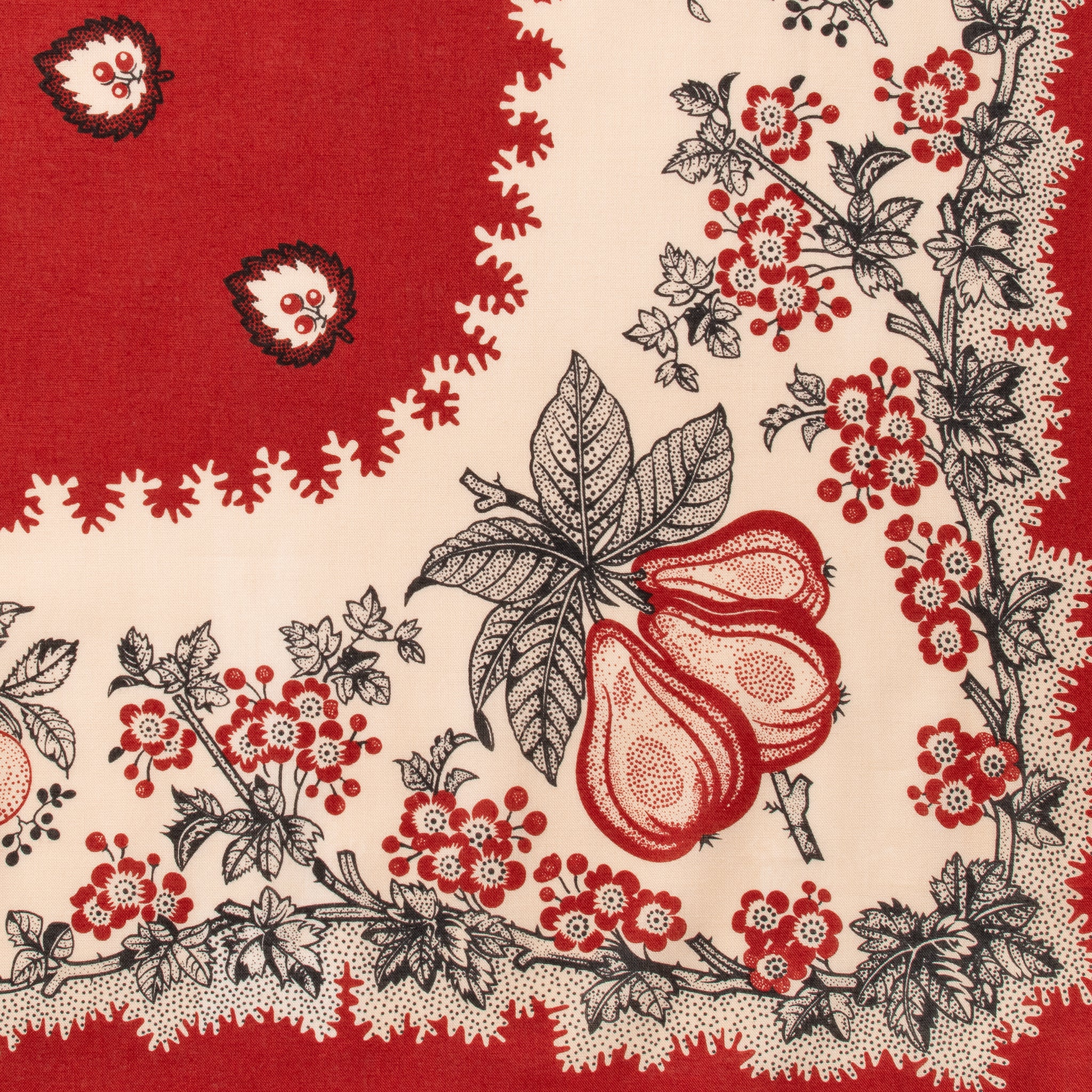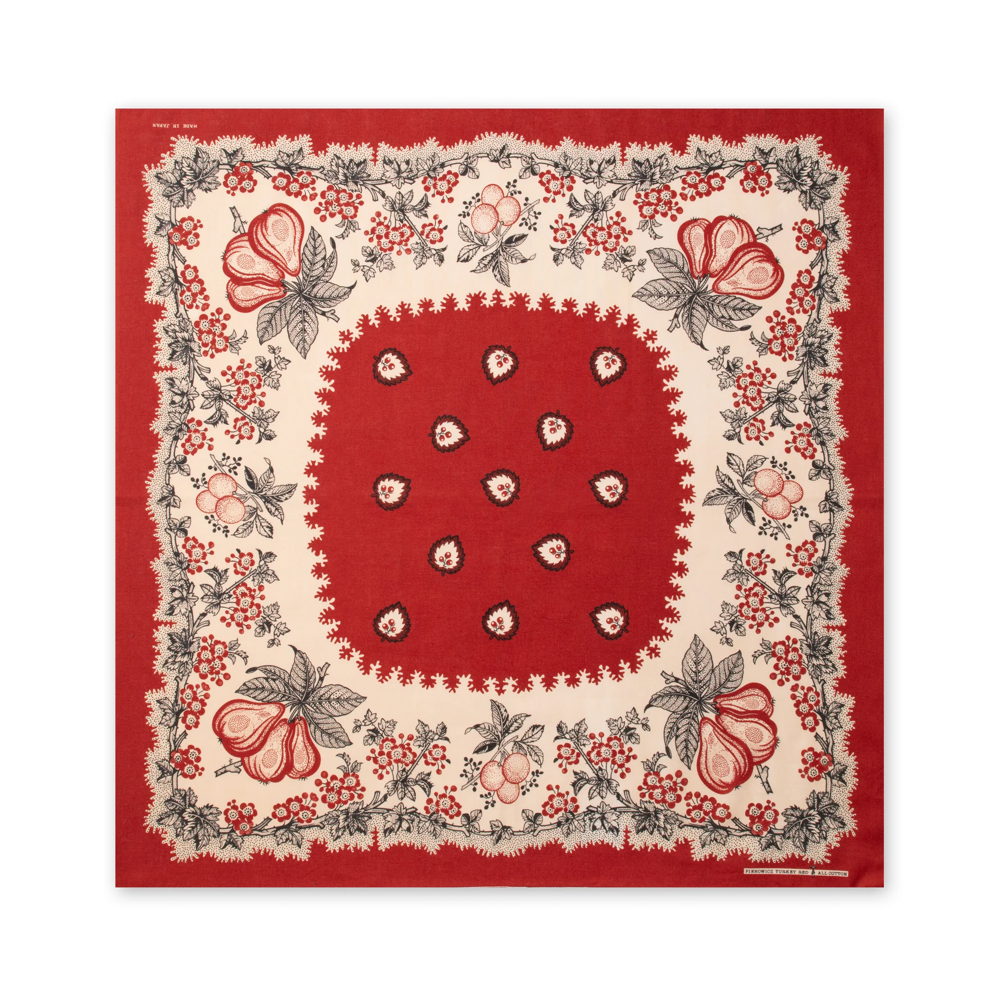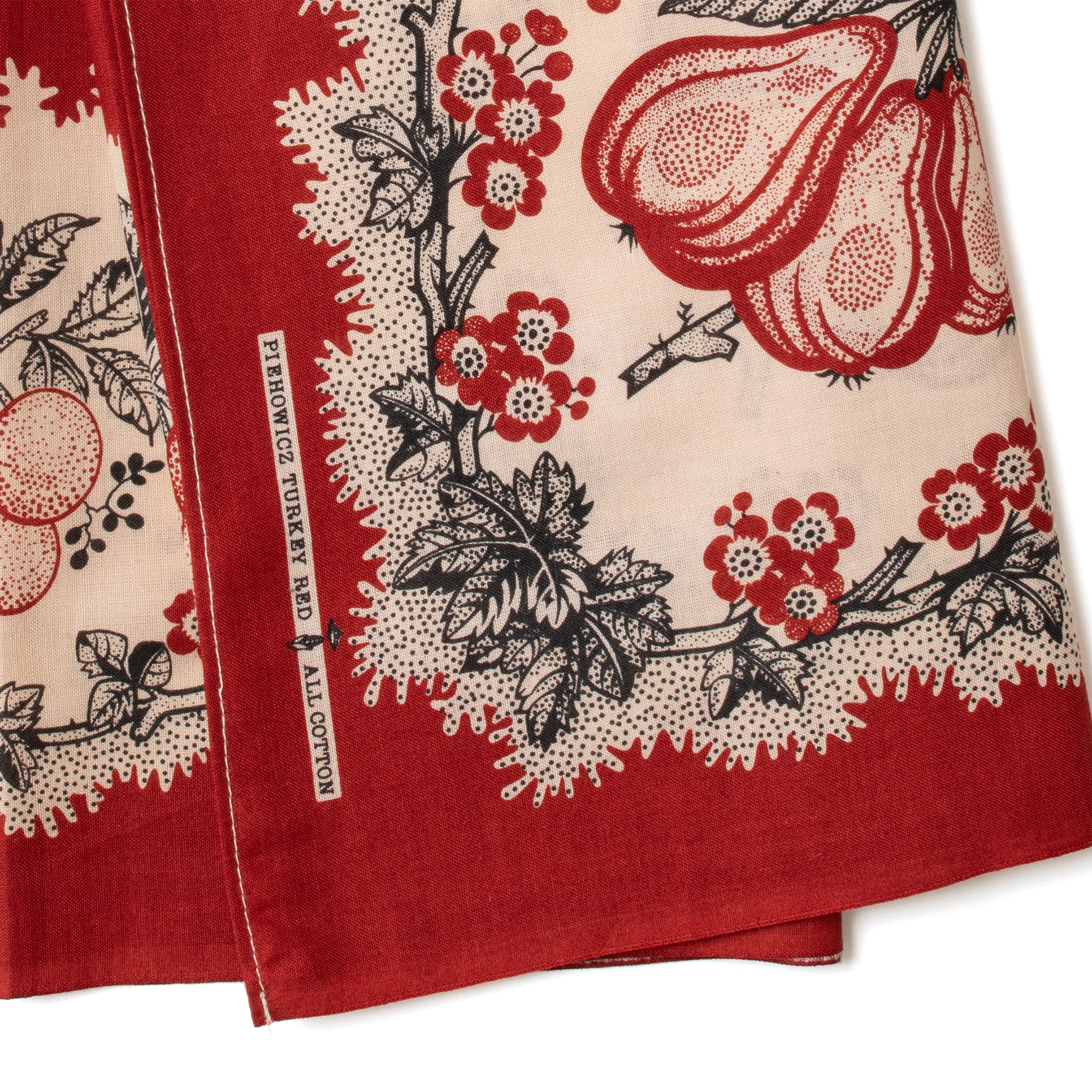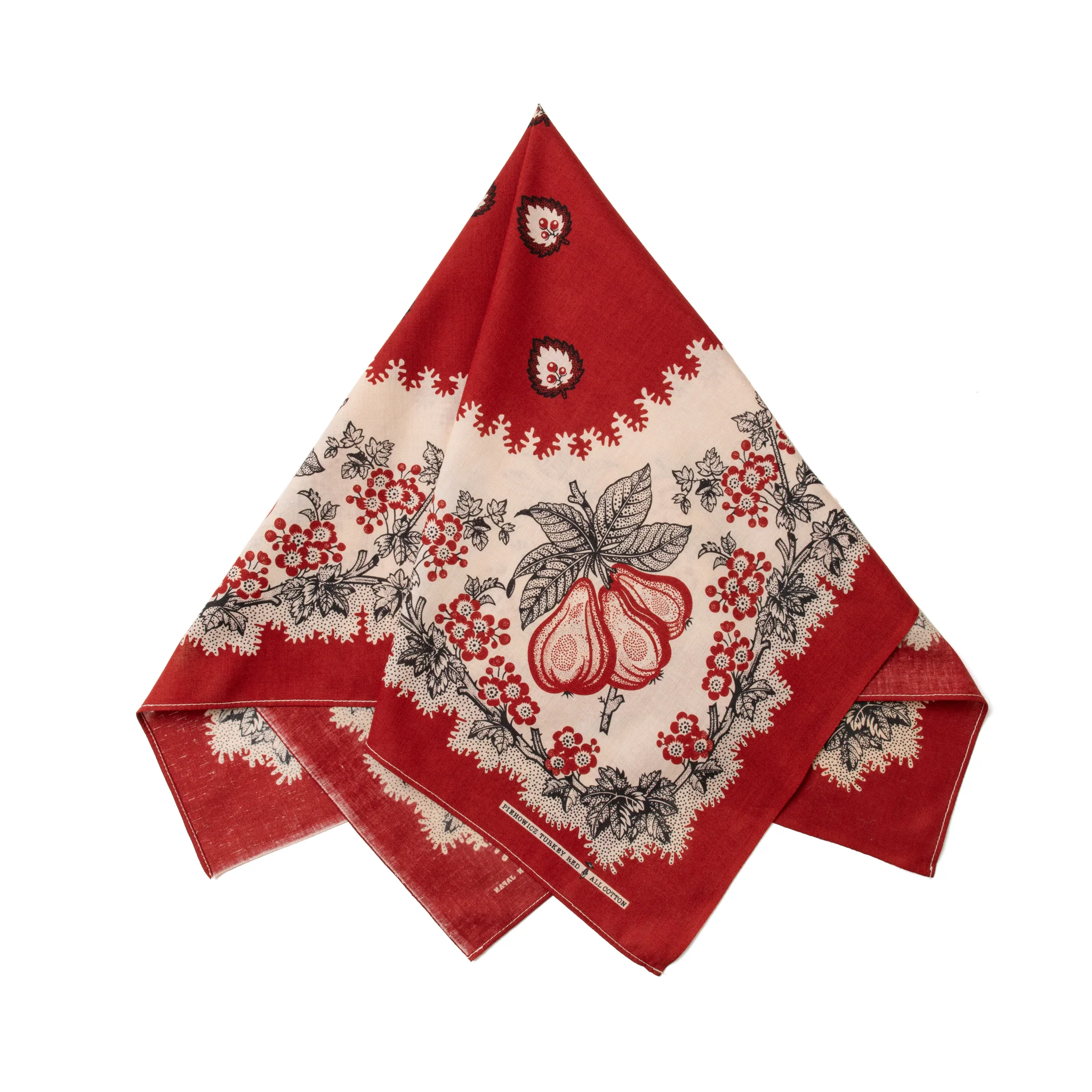 Painstakingly reproduced from a vintage bandanna from friend and collector Cory Piehowicz. The theme is pears or quince kind of hard to tell exactly but we have aptly named it poire for pear. This very detailed design took weeks of hard work from the hand of Kaga Satoshi. Expertly redrawn and detailed for One Ear Brand. The reds are a little different from authentic reproductions we have tried to use: a dark black, and a faded barn red. This color combination is really popular and easy to style anything with.