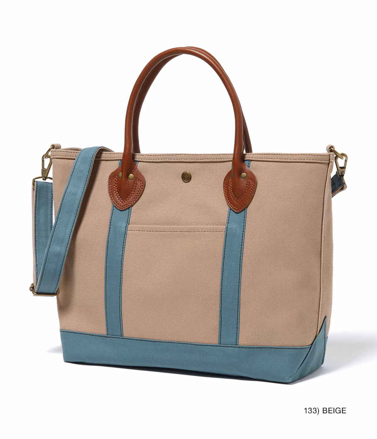 This tote bag is created by combining two different types of thick, high-quality canvas woven in Japan: No. 4 and No. 10. The combination of the sturdy, substantial No. 4 canvas and the supple, easy-to-handle No. 10 canvas, along with the dark-colored leather handles, creates a perfectly balanced design that is effortlessly stylish yet refined. It feels comfortable in your hand from the very first use, and its texture deepens with each passing day.